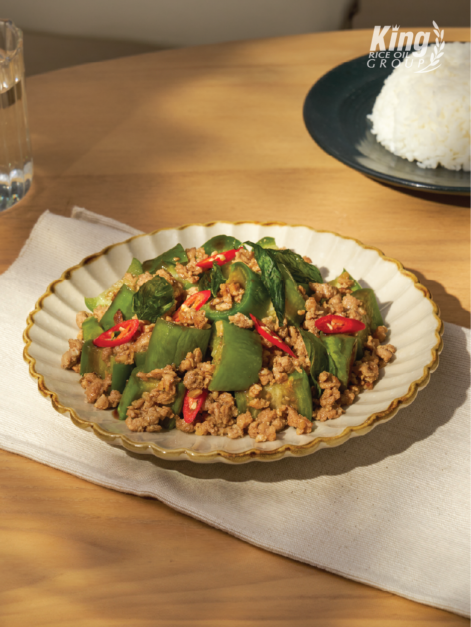 2. ใส่น้ำมันรำข้าวคิง 1 ช้อนโต๊ะในกระทะ ผัดกระเทียม และพริกเล็กน้อย ใส่เนื้อหมูบด ผัดให้พอเกือบสุก