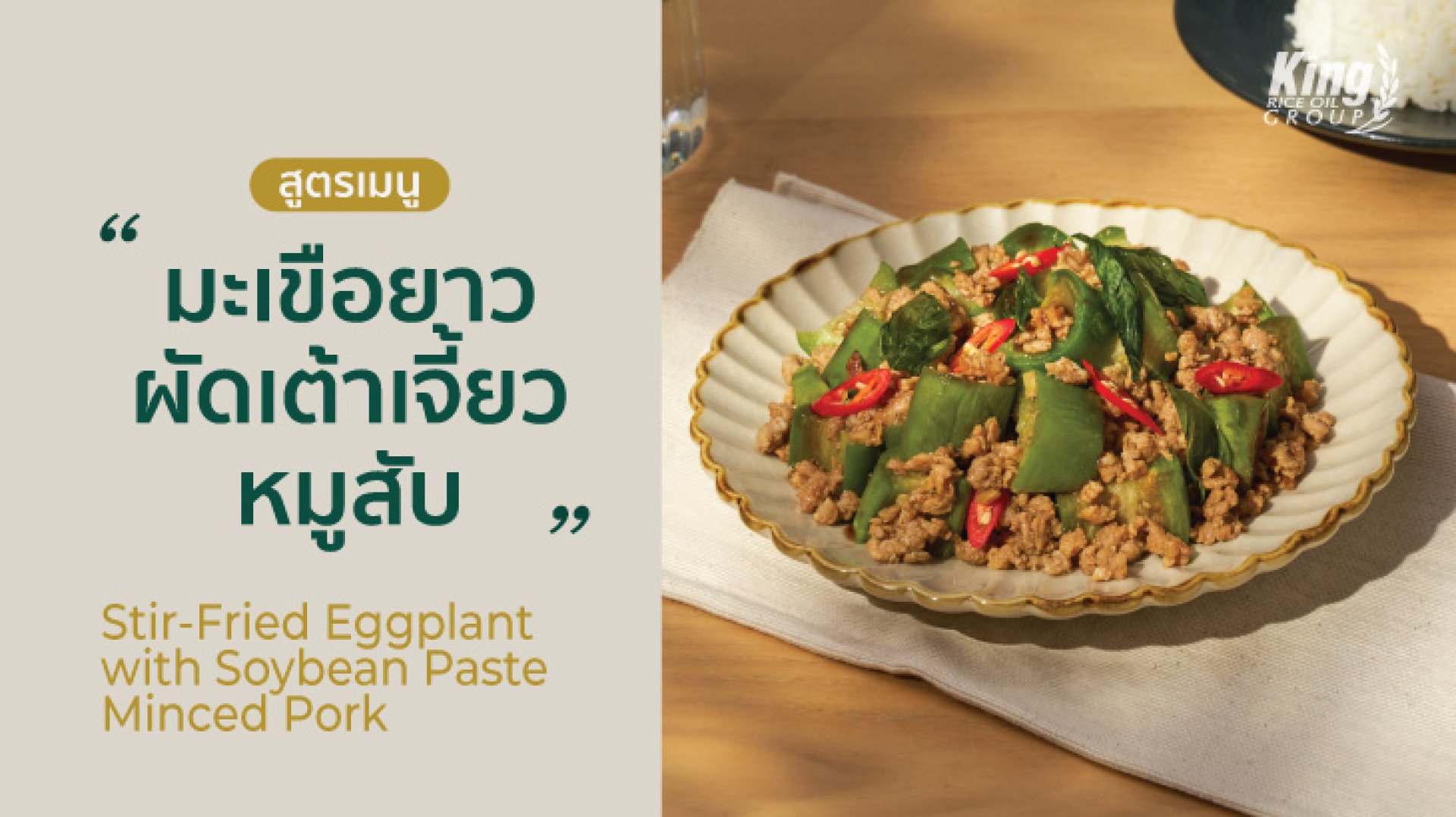 สูตรเมนู มะเขือยาวผัดเต้าเจี้ยวหมูสับ Stir-fried Eggplant with Soybean Paste Minced Pork เป็นเมนูสุขภาพที่ทั้งอร่อยและมีคุณค่าทางโภชนาการครบถ้วนในจานเดียว มะเขือยาวมีไฟเบอร์สูง ซึ่งช่วยให้ระบบขับถ่ายทำงานได้ดีขึ้น ส่วนหมูสับให้โปรตีนที่ช่วยซ่อมแซมร่างกาย ขณะที่เต้าเจี้ยวเพิ่มรสกลมกล่อมพร้อมจุลินทรีย์ดีจากการหมัก ช่วยเรื่องการย่อยอาหาร เมื่อนำมาผัดด้วยน้ำมันรำข้าวคิง ซึ่งมีวิตามินและสารตามธรรมชาติสูงช่วยเพิ่มคุณค่าและประโยชน์มากขึ้น เป็นเมนูง่ายๆ ที่ทั้งอร่อยและดีต่อสุขภาพอย่างแท้จริง ลองทำกันเลย!