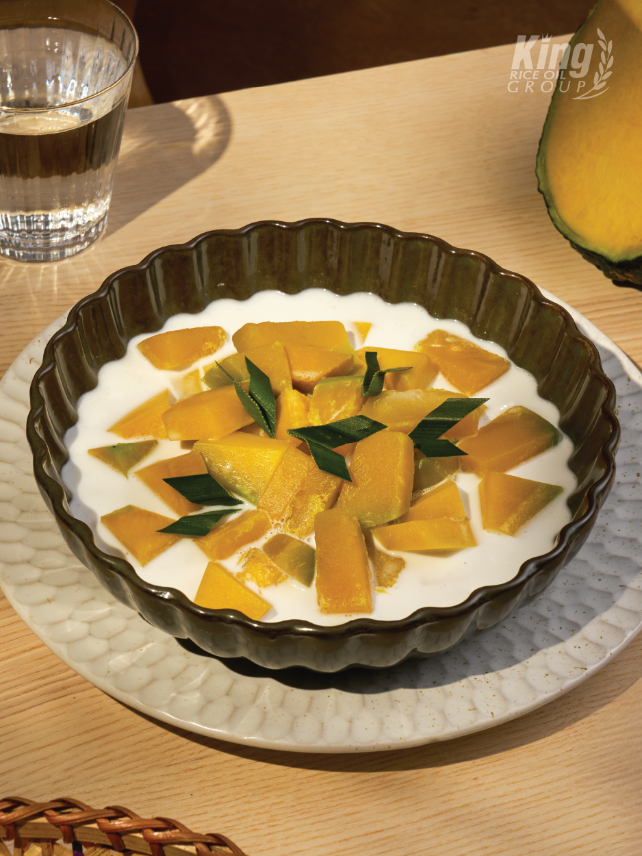 สูตรเมนู แกงบวดฟักทอง (ไร้กะทิ) Light Poached Pumpkin in Ricely Creamer ขนมไทยสุดคลาสสิกที่อร่อยได้โดยไม่ต้องพึ่งกะทิ! แกงบวดฟักทอง (ไร้กะทิ) สูตรนี้ใช้ ครีมน้ำมันรำข้าวไรซ์ลี่ ทดแทนกะทิ ให้รสหอมมันกลมกล่อมแต่ไม่เลี่ยน ฟักทองเนื้อนุ่มหวานธรรมชาติ ได้ทั้งรสชาติละมุนและไขมันดีต่อสุขภาพ เหมาะสำหรับคนที่อยากกินของหวานแบบไม่รู้สึกผิด เบา อร่อย และดีต่อใจทุกคำ ลองทำกันเลย!
